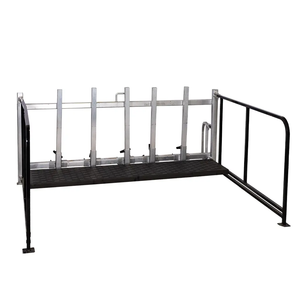 Showcase your stock with the most versatile Show Rail. Lightweight, this show rail is made entirely of aluminum. Extremely space-saving, it folds flat for easy storage and transport, no need to completely disassemble. Nose Loop Head Pieces are standard equipment with the complete show rail, but the option exists to use any of the new Universal Head Pieces. Head Pieces easily adjust in height to accommodate various size animals. Equipped with locking brackets to hold the head piece sleeves, allowing you the ability to easily adjust for the number of animals on display. The Show Rail is designed to hold 5 lambs/goats although head pieces can be added or removed. Included floor is constructed of laser cut aluminum and coated with the super grip no-slip surface for the safety of your animal.
