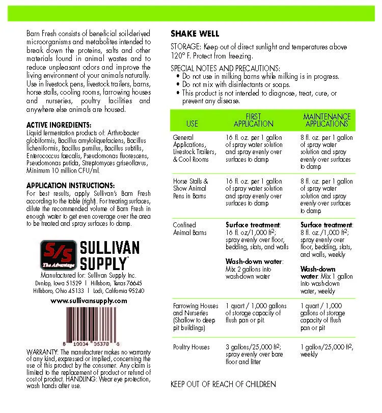 Barn Fresh contains soil-derived microbes and metabolites to naturally break down the proteins, salts, and other materials found in urine and fecal matter that cause unpleasant odors such as ammonia. Use in livestock pens, barns, horse stalls, and anywhere else animals are held.