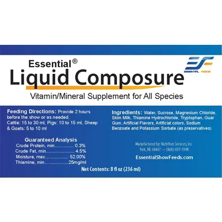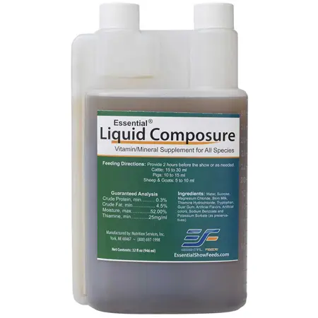 Essential Liquid Composure, a vitamin/mineral supplement for all species, is formulated to provide a calming effect to the nervous system. Stimulates the production of a hormone that helps start the sleep cycle, causing animals to relax. Helps your animal overcome anxiety from stressful situations, including showing and transporting. Essential Composure contains thiamine, tryptophan, and magnesium. Feeding Directions: Provide 2 hours before the show or as needed. Cattle: 15 to 30 ml, Pigs: 10 to 15 ml, Sheep and Goats: 5 to 10 ml.