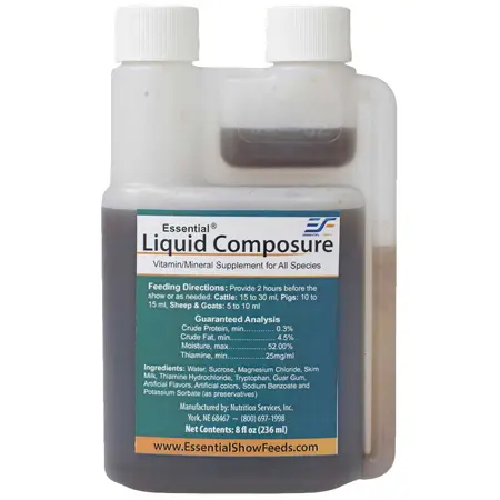 Essential Liquid Composure, a vitamin/mineral supplement for all species, is formulated to provide a calming effect to the nervous system. Stimulates the production of a hormone that helps start the sleep cycle, causing animals to relax. Helps your animal overcome anxiety from stressful situations, including showing and transporting. Essential Composure contains thiamine, tryptophan, and magnesium. Feeding Directions: Provide 2 hours before the show or as needed. Cattle: 15 to 30 ml, Pigs: 10 to 15 ml, Sheep and Goats: 5 to 10 ml.