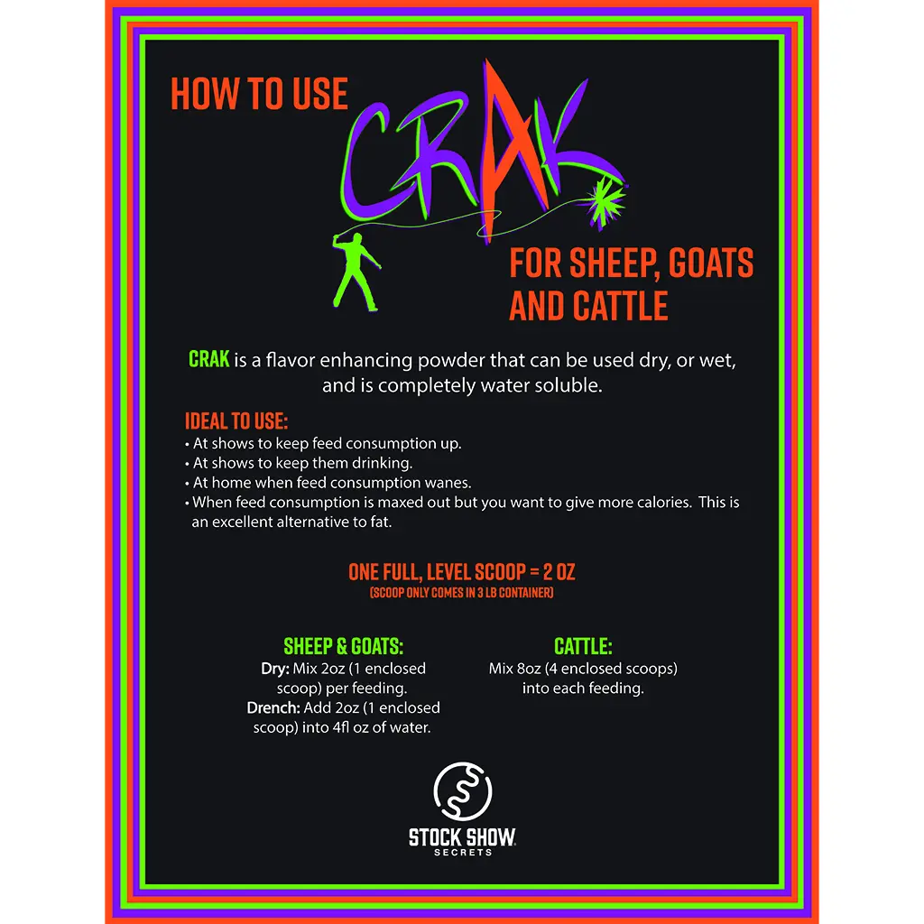 CRAK is a unique and innovative new product from Stock Show Secrets. CRAK is for all genders and species of show livestock; pigs, cattle, sheep and goats and is intended to be added to feed or water to enhance the flavor and smell. It can be used dry by mixing into their feed, or mixed with water to slop feed, increase water consumption, or training to drench.