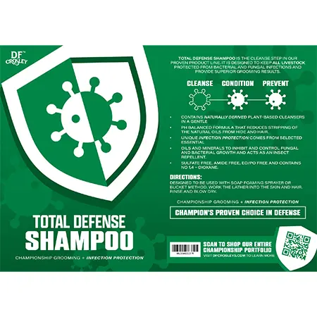 This 32oz. bottle of Total Defense Shampoo is the CLEANSE step in infection protection by cleaning your animal. This product is designed to keep livestock protected from bacterial and fungal infections.