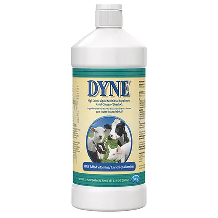 Each ounce of Dyne provides 150 calories for extra energy for peak performance. Administer to sheep, pigs, and goats at the rate of 3 oz. per day, and cattle at the rate of 9 oz. per day.