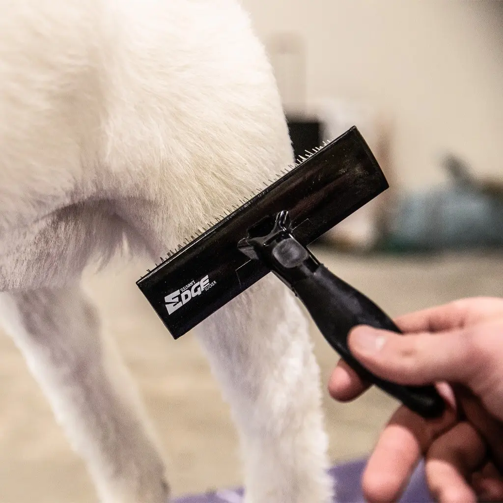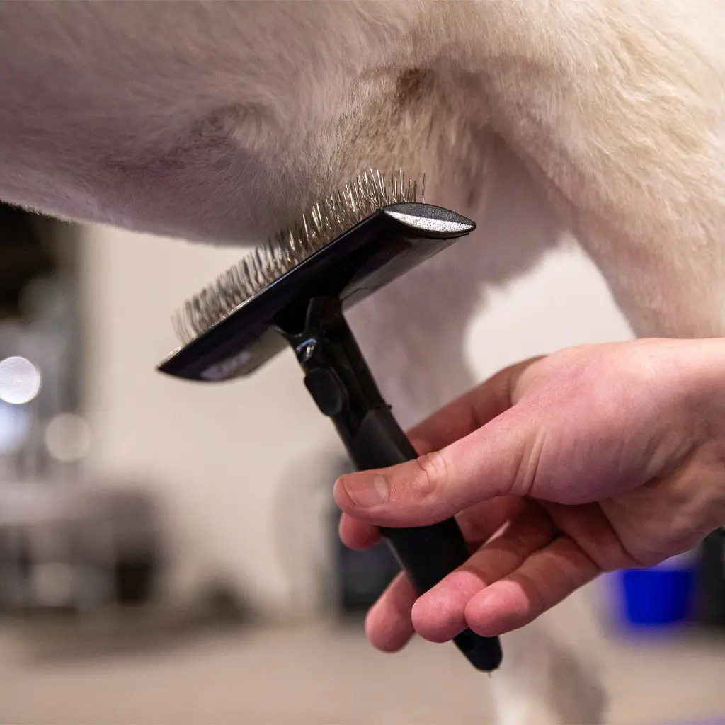 The Edge Sensation™ is great for popping leg wool or hair. The unique spacing allows for minimal wool pullout on lambs and is tremendous for working leg hair on cattle and goats. It features a 5.5″ wide head consisting of 79 plastic ball-tip bristles measuring 5/8″ long.