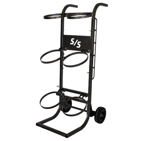 The most durable feed cart to date! Great for shows or home; organize your feed with the new space-saving Sullivan’s Feed Station. Constructed of durable 1.25” square steel tubing construction that will stand up to the harshest challenges. Powder coated for ultimate surface protection. Great balance! – does not get tipsy when loaded like other carts. Will accommodate six round 5-gallon sized buckets. Includes a movable basket that will hold supplies, brushes, sprayers, etc. It can hang from multiple locations on the back side of the cart. The whip holder on the side easily holds 4 to 6 whips. Hangers on the opposite side are for hanging clip-on feeders between feeding times. Also has the capability to hang a Jackpot show box on the backside, ultimate versatility, and space saver! Equipped with 8” flat free tires for easy movement when loaded.