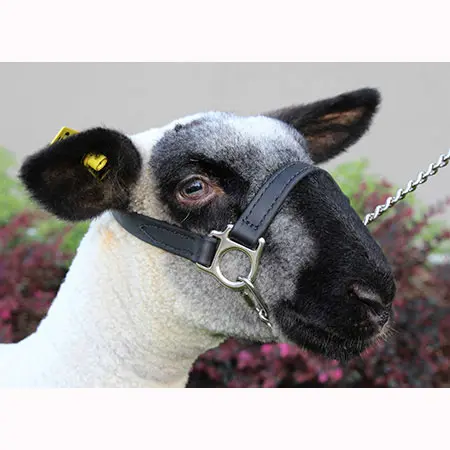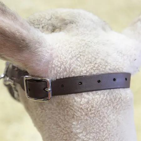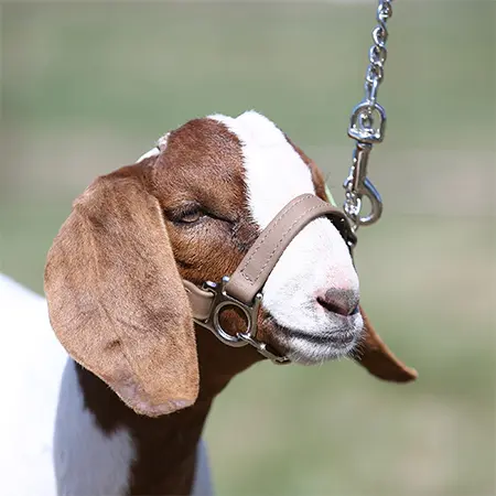 Biothane coated webbing goat show halter that is assembled with double bound stitching for durability. This halter is easily disinfected and is sold complete with the the chain lead