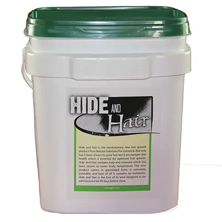 Hide and Hair is a revolutionary hair growth product. Not only has it been shown to grow hair, but it encourages skin health which is essential for optimum hair growth. Hide and Hair contains kelp and seaweed which has been shown to lower body temperature. This product comes in a granulated form, is extremely palatable, and best of all, it contains no melatonin. When feeding products containing melatonin there is a point where hair growth reaches a peak and then the hair sheds, but with Hide and Hair you are able to achieve consistent hair growth over a longer period of time. You should start seeing results in 45 days with proper management. Feed at least 60 to 90 days before show. Top dress at the rate of 9.6 oz. (1.5 scoops) per head per day. 45 day supply. Hide and Hair is research based, field tested, and produces the strongest results in the industry! 27 lb. bucket or refill bag.
