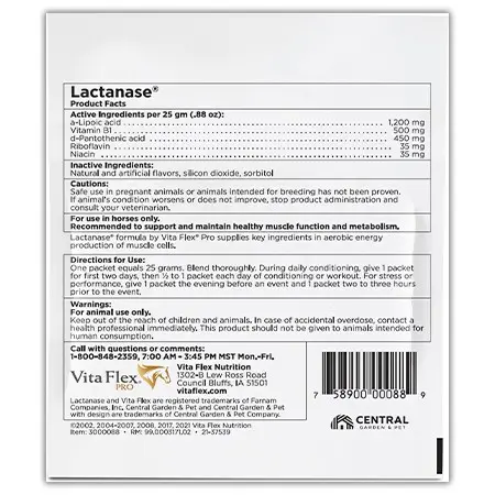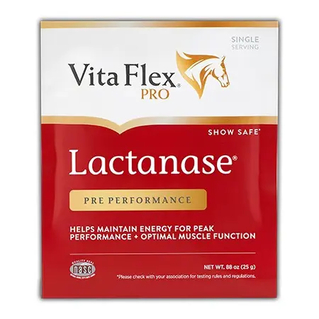 Lactanase supports healthy muscle function and metabolism in horses. It supplies nutrients important for the formation of acetyl coenzyme A, the key to effcient energy release from both carbohydrates and fats. This supports the animal to be shown at a higher potential with more flexibility and energy. Top dress two packets per day for two days prior to show and one packet three hours immediately before show.