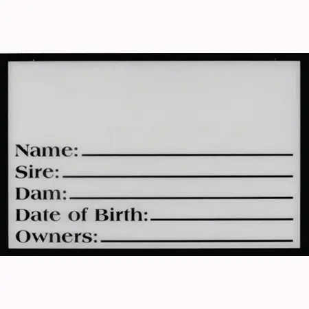 This durable and reusable sign includes Name, Sire, Dam, Date of Birth and Owner. Black print on white background