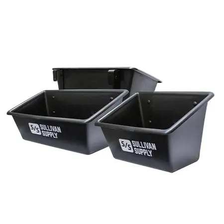 Great for individual animal feeding. Grain, hay, mineral, etc. Injection molded with tough, No-Break Poly Propylene plastic. Injection molding allows for a more consistent wall thickness for added strength. Bull-Nose rounded edges around top perimeter are gentler to livestock with NO harsh sharp edges. The lower front edge offers easy access for animals to reach feed. Equipped with powder coated metal hanging brackets to easily hang over 2x dimensional lumber or similar size pipe fence. Easy to clean.