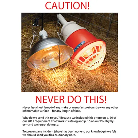 Never lay a heat lamp (of any make or manufacture) on straw or any other flammable surface—for any length of time. We recommend that you keep the lamp at least 20″ away from the ground/animal(s). To ensure safety, please self-inspect the plug and connection (or ask a certified electrician to do so.)