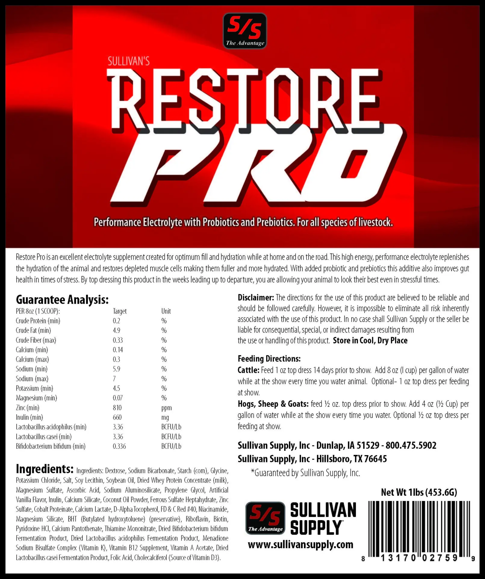 Restore Pro is high energy, performance electrolyte that replenishes the hydration of the animal and restores depleted muscle cells making them fuller and more hydrated. With added probiotic and prebiotics Restore Pro also improves gut health in times of stress. Restore Pros appealing flavor additive increases fluid consumption resulting in the best possible fill and muscle definition. Use Restore Pro as a daily top dress to keep animal electrolytes and gut health in check. Add to animal’s water weeks leading up to travel so your animal will look its best when arriving to a show.