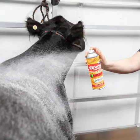 Use REVIVE LITE once the animal has been washed and blown completely dry. Coat the entire body evenly including legs, belly and tail head. Comb in, roto brush, blow dry and style hair like normal.