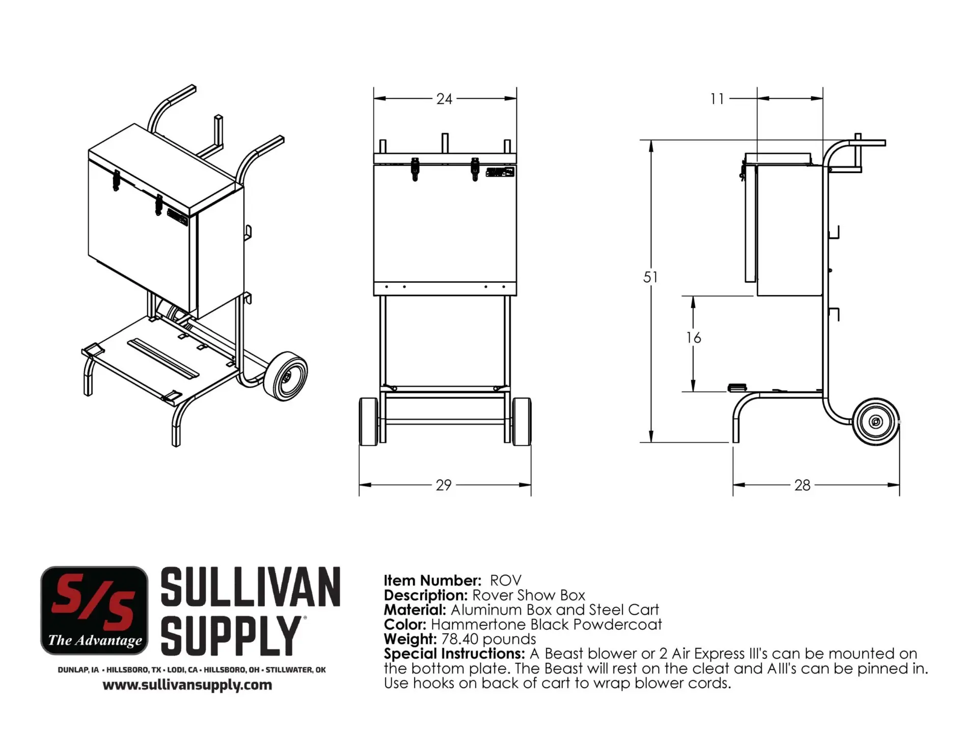 The all-in-one portable design of the ROVER makes traveling to shows easy. Show box on top blowers below… a great combination to maximize your space! The show box is constructed of smooth aluminum and finished in a beautiful Black Hammer Tone powder coating for long term beauty.