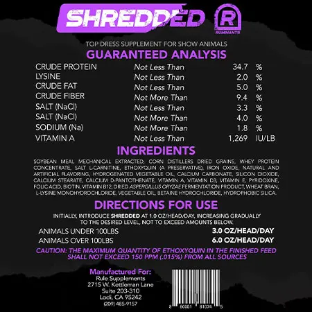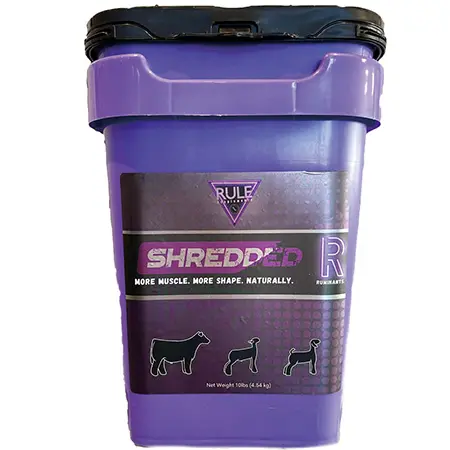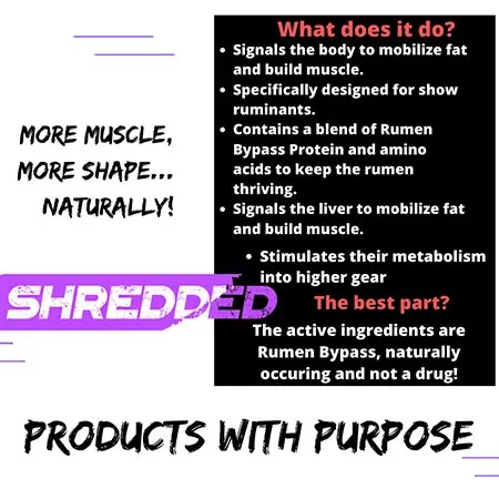 More Muscle, More Shape! Shredded is an all-natural blend of nutrients that signal the metabolism to mobilize fat, while providing the specific building blocks to increase lean muscle mass and increase muscle volume to the animal’s genetic potential. Shredded R’s key nutrients are all provided in a rumen bypass form, ensuring that they get to your animal’s system and are not destroyed by the microbes. Burn Fat without sacrificing muscle shape, maximize composition and achieve a fresh look and handle!