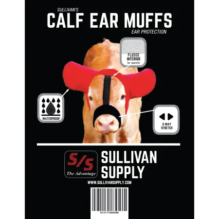 Frozen calf ears? Solve the problem with Calf Ear Muffs. Protect those newborn ears from frost and severe cold. Very easy to slip on, stays in place with velcro. A must for the cow/calf producer!