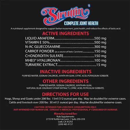Rule Supplements has worked with industry leading breeders and showmen to develop a product that addresses all aspects of joint health. Struttin is designed to support better and more fluid movement, improve joint health while reducing the effects of lactic acid as your livestock power through the competition.