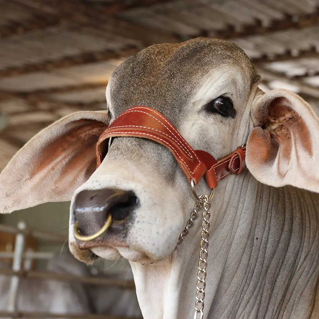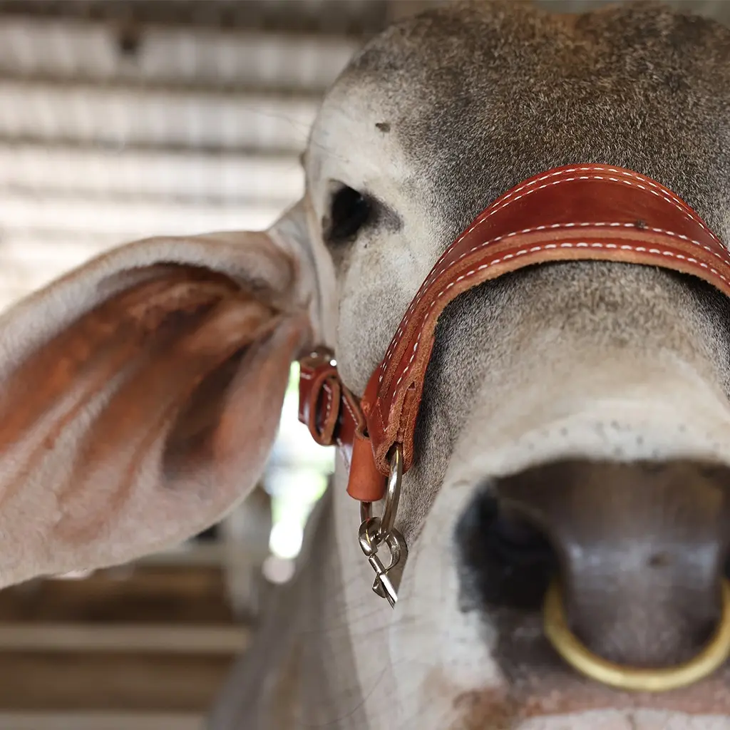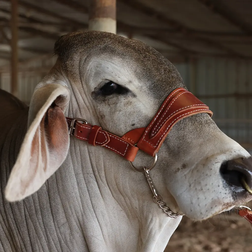 For the Brahman and American breed enthusiasts, this natural-colored show halter was designed with the traditional cattleman in mind. The large bronc style scalloped noseband stays in line with the classic southern style show halter. Big and bold, this oversized halter features thick leather with a wide crown strap and large roller buckles on the cheek pieces. There is no question this halter is as sturdy as it looks. For use on bulls or heifers, adjustable. Available in a natural finish.
